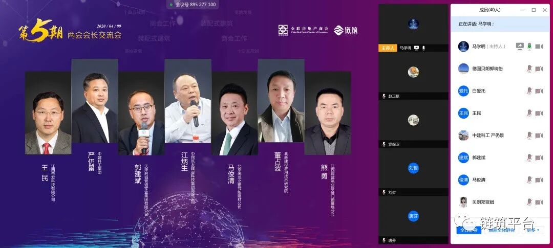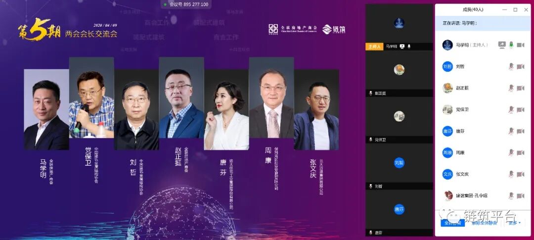 当前,我国疫情防控形势持续向好,社会经济发展和生产生活秩序加快恢复。在抗击疫情过程中,火神山、雷神山等各地医院的高效建设,不仅为防控疫情做出巨大贡献,同时也充分展现了装配式建筑的效率优势。在政策不断蓄力以及新技术应用的双重加持下,我国装配式建筑有望迎来高速增长的发展时期。长远来看虽然发展潜力巨大,但仍面临着应用普及程度尚未达到预期的问题。因此,为进一步探究装配式建筑的发展困境,推动市场广泛应用和普及。2020 年 4 月 9 日下午,全联房地产商会装配式建筑分会、产业链创新合作分会联合召开了“携手抗疫•共克时艰,链筑两会第五期会长交流会”在线会议,此次会长交流会汇聚了全联房地产商会、中国建筑金属结构协会、江西省建筑业协会的商协会领导专家及保利湾区投资发展、碧桂园控股、旭辉集团、龙湖地产、北大资源、朗诗集团、世茂集团、陕建发展、远大住工、德国(贝朗)、华德隆建材、中建科工、北新建材、美好置业、中民筑友、绿筑集成、天住天工、杭州之江、奋发科技、君诚管道、米兰之窗、广联达、建谊集团、南京亚派等两会副会长和产业链企业代表共近50位领导嘉宾的参与。