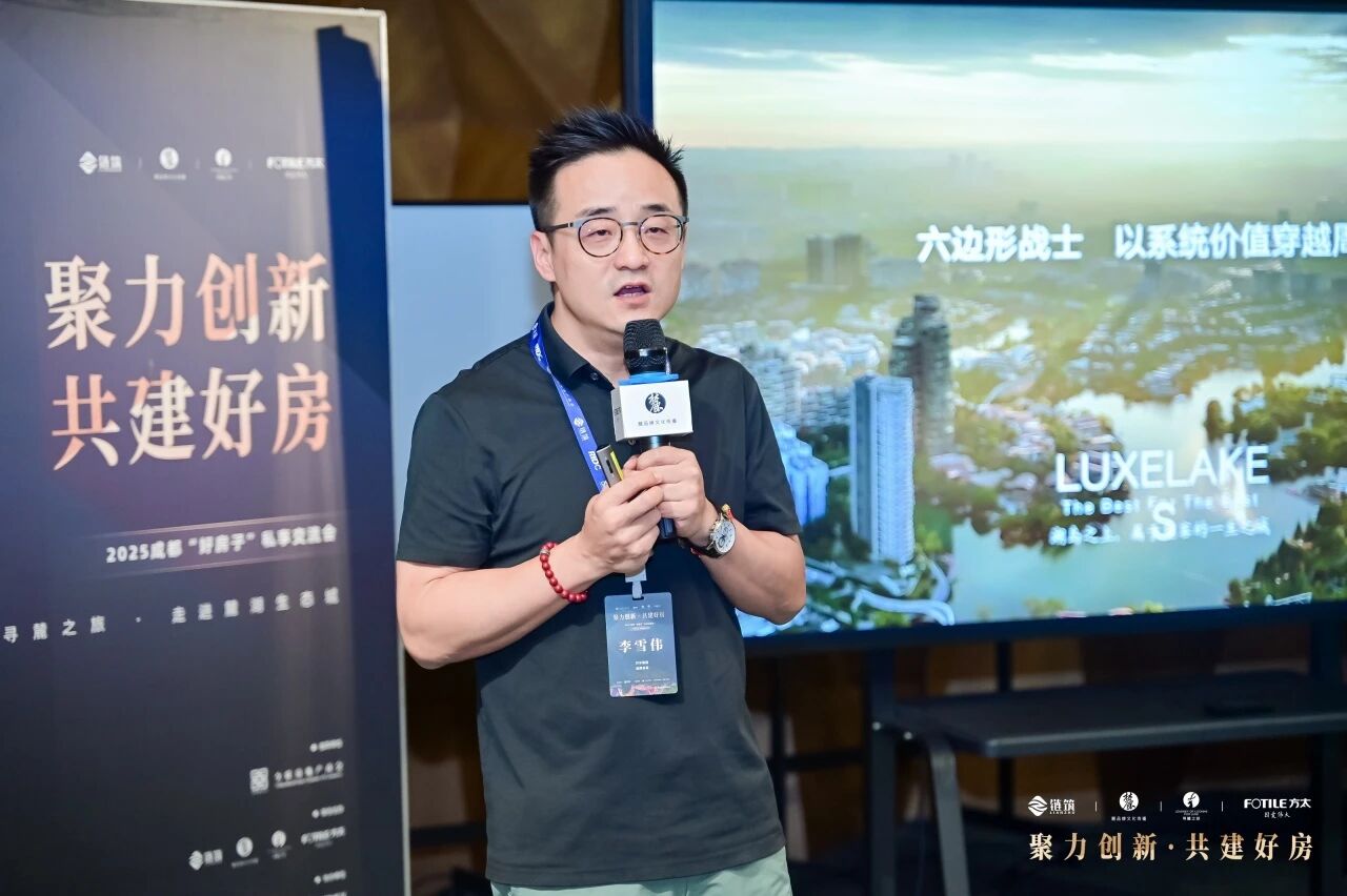 万华集团品牌总监李雪伟先生以《万华六边形-以系统价值穿越周期》解密麓湖生态城成功密码。他阐述万华的“六边形能力”:产品研发、用户运营、生态整合、文化塑造、技术迭代和社区治理。“麓湖不是偶然‘神盘’,而是十余年系统打磨的成果。中央部署‘发展新质生产力’,要求我们以顶层设计应对周期波动。”李雪伟举例,万华通过用户行为数据分析,持续升级高端需求响应,如智慧安防与自然景观的融合。他强调:“一切设计均要以人为本,这是‘好房子’从概念走向落地的关键。”