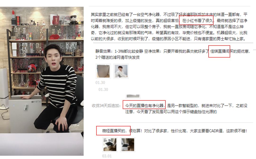 同时,通过对目前市场上各品牌驱动因素的分析,我们发现除了产品、品牌、价格等方面的因素外,在渠道及宣传方面,企业间也存在差异,像与平台合作开发机型,嵌入智能系统的产品得到了平台资源加持,竞争能力明显加强。同时像李佳琦、薇娅等直播对净化器的份额增长拉动也极为明显,通过对小米、布鲁雅尔、IAM等品牌的直播分析来看,净化器直播流量、成交率等相对较高。从这一方面来看,在净化器未来市场社交性电商、传播将成为企业不可忽略的要点之一,尤其是在“宅”经济盛行的情况下,生动、直接、交互的产品介绍远胜于文字图片等,线上直播也进一步推动了净化器在线上市场的传播。
