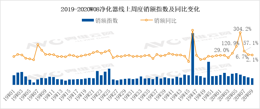 据奥维云网(AVC)线上监测数据显示,2020年净化器自第4周开始,线上市场销售开始出现大幅度的同比上扬,从04-07四周累计同比情况来看,净化器线上市场销额同比增长89.8%。从用户评论分析来看,受到疫情影响,净化器产品成为线上受热捧的产品之一。但是我们从第8周数据来看,净化器线上销售额同比增速仅为6.7%,在第9周净化器线上销额增幅收窄至2.1%,市场规模及增速都出现了明显的回调。这是不是说净化器市场在经历了恐慌性应激增长后,市场开始萎缩了呢?