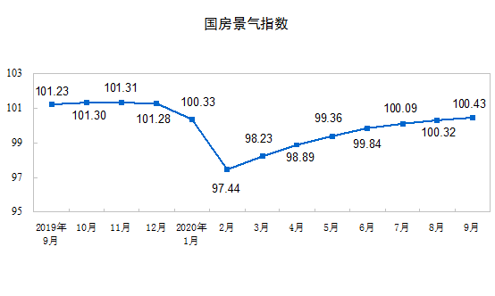 9月份,房地产开发景气指数(简称“国房景气指数”)为100.43,比8月份提高0.11点。