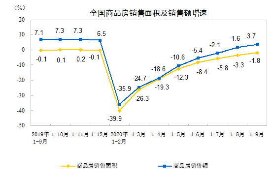 1—9月份,商品房销售面积117073万平方米,同比下降1.8%,降幅比1—8月份收窄1.5个百分点。其中,住宅销售面积下降1.0%,办公楼销售面积下降16.5%,商业营业用房销售面积下降15.3%。商品房销售额115647亿元,增长3.7%,增速提高2.1个百分点。其中,住宅销售额增长6.2%,办公楼销售额下降15.7%,商业营业用房销售额下降17.1%。