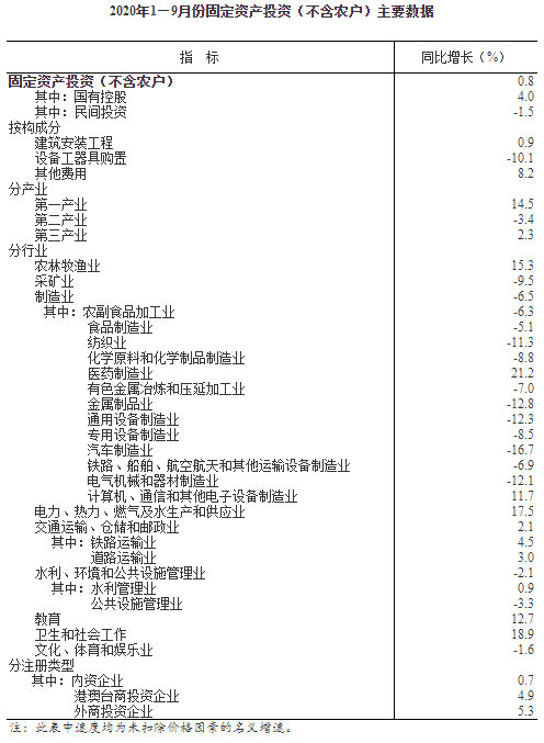 1—9月份,全国固定资产投资(不含农户)436530亿元,同比增长0.8%, 1—8月份为下降0.3%。其中,民间固定资产投资243998亿元,下降1.5%,降幅比1—8月份收窄1.3个百分点。从环比速度看,9月份固定资产投资(不含农户)增长3.37%。