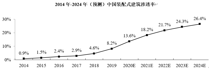 亿平方米,较2018年增长45%,占新建建筑面积的比例约为13.4%,近4年年均增长率为55%,装配式建筑渗透率达到8.2%(按照建筑企业统计口径计算),呈现良好的发展态势。未来随着各省市地区的装配式建筑推进政策的进一步细化和落实,以及装配式建筑在推动城乡建设领域高质量发展和解决建筑业节能环保、劳动力不足、缩短工期等方面的优势进一步随着技术的进步得到提升,装配式建筑的渗透率将进一步提升,预计到2024年将达到26.4%。