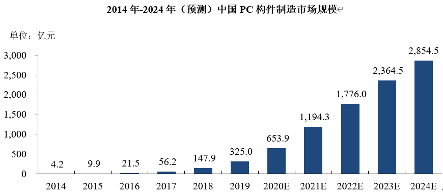 装配式建筑PC构件的市场规模从2014的4.2亿元增长到2019年的325.0亿元,年均复合增长率达到138.2%。预计到2024年市场规模将进一步增长到2,854.5亿元,2020年到2024年期间的年均复合增长率达到54.4%。随着装配式建筑技术标准的不断完善和相关推进政策的实施,PC装配式建筑的渗透率和装配率都将显著提升,从而推动中国装配式建筑PC构件市场快速增长到较高水平。