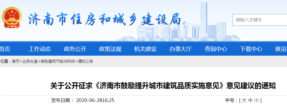 为深入贯彻落实党中央、国务院加快生态文明建设和绿色发展的决策部署,切实促进城乡建设模式转型升级,全面推进我市住房和城乡建设领域绿色建筑发展,改善人居环境、减少资源消耗,着力提升建筑品质,努力实现“人住好房”,不断满足人民群众日益增长的居住环境品质需求。根据市政府要求,我局起草了《济南市鼓励推动高品质建筑发展实施意见》 (征求意见稿),现向社会公开征求意见建议。