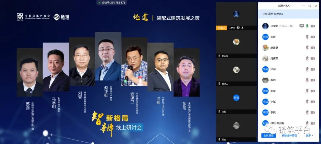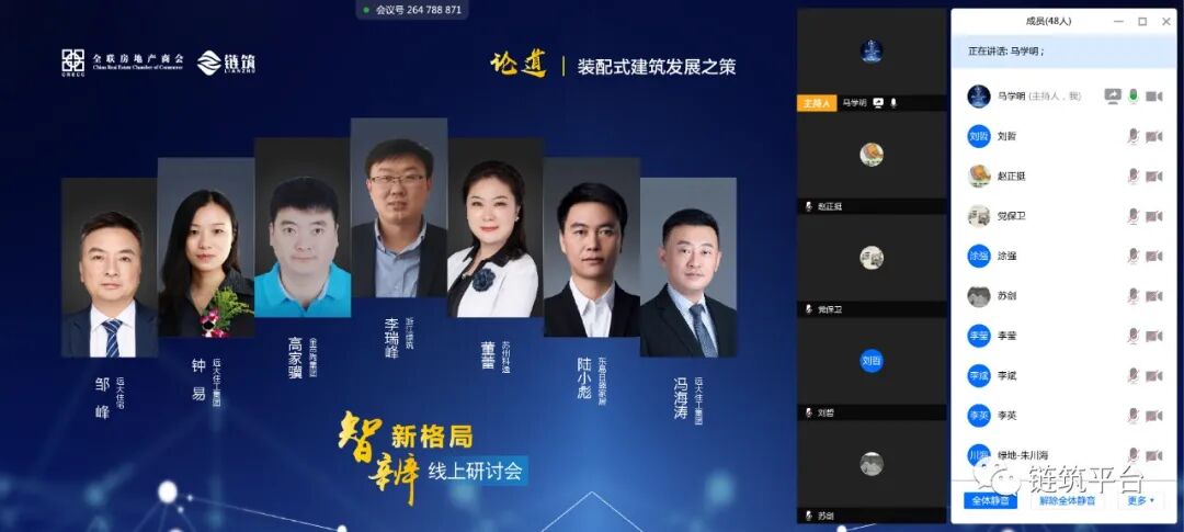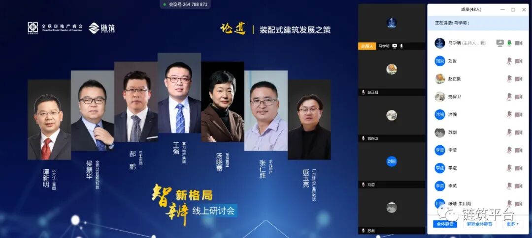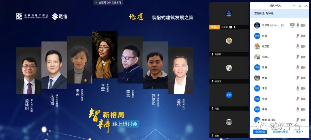 在此背景下,【智辨·新格局】第一期在线研讨会:“论道装配式建筑发展之策”于4月3日成功召开。本次研讨会由全联房地产商会、链筑平台共同发起,由全联房地产商会装配式建筑分会、产业链创新合作分会联合主办,汇聚来自全联房地产商会、中国建筑金属结构协会的专家领导以及碧桂园、恒大地产、绿地集团、中铁建房地产、龙湖地产、金茂集团、招商蛇口、富力地产、金地集团、龙光地产、东原集团、路劲地产、北大资源、北京泽信等近二十家龙头房地产企业及远大住工、广州建研院、中建科工、绿筑集成、东易日盛、苏州科逸、金意陶陶瓷、亚士创能等装配式建筑产业链各领域代表企业共近60位嘉宾汇聚线上,共议疫情后装配式建筑的发展之道。