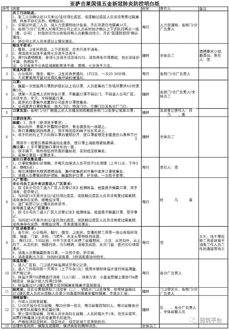 在复工后的亚萨合莱国强五金,有一张叫做‘新冠肺炎防控明白纸”的独特战“疫”指南,上面罗列了从员工行动轨迹、勤洗手要求、工作场所通风要求,口罩管理、消毒要求、隔离室、错峰就餐等13个细项的要点措施,一目了然,责任到人。一张表格看后所有事情明明白白,不愧为“明白纸”。