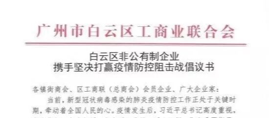 • BAIYUN作为广州市白云区工商业联合会主席单位,第一时间在白云区非公有制企业内发布携手坚决打赢疫情防控阻击战倡议书,携手号召区工商联各会员企业,贡献力量。
