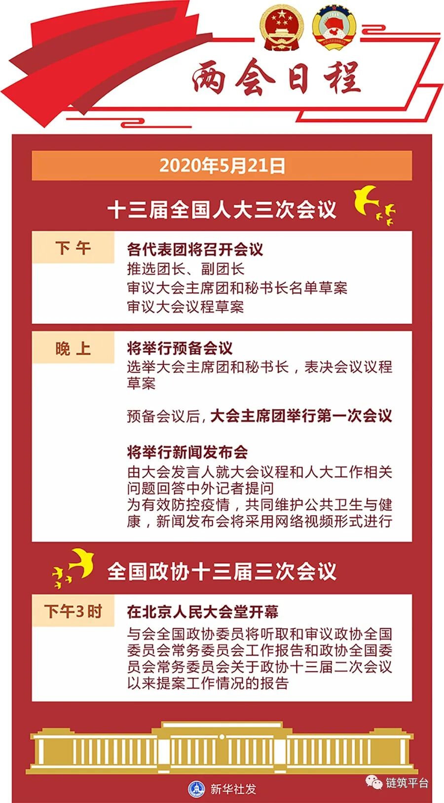 21日下午,十三届全国人大三次会议各代表团将召开会议,推选团长、副团长;审议大会主席团和秘书长名单草案;审议大会议程草案。21日晚,十三届全国人大三次会议将举行预备会议,选举大会主席团和秘书长,表决会议议程草案。预备会议后,大会主席团举行第一次会议。21时40分,十三届全国人大三次会议将举行新闻发布会,由大会发言人就大会议程和人大工作相关问题回答中外记者提问。为有效防控疫情,共同维护公共卫生与健康,新闻发布会将采用网络视频形式进行。